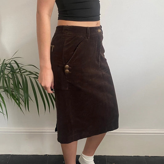 Cristina Capucci Midi Cord Skirt - 28W UK 8 Brown Cotton Blend