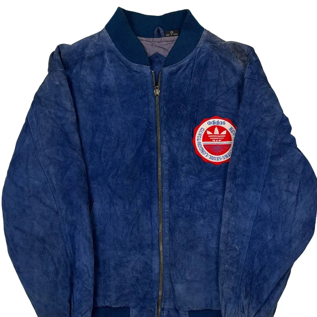 1980S Adidas Spellout Bomber Jacket - Small Blue Suede