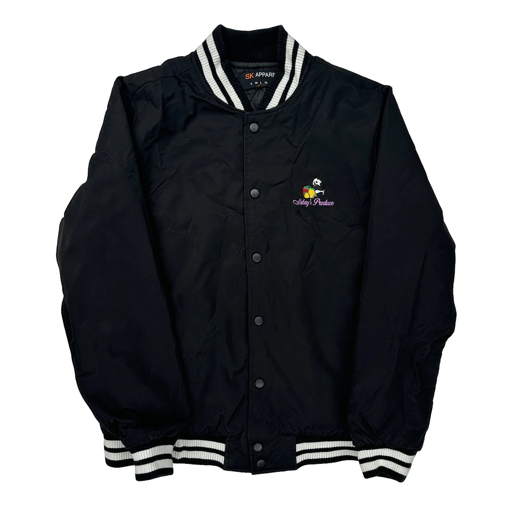 Black Varsity Jacket With White Stripes And Adley'S Produce Logo