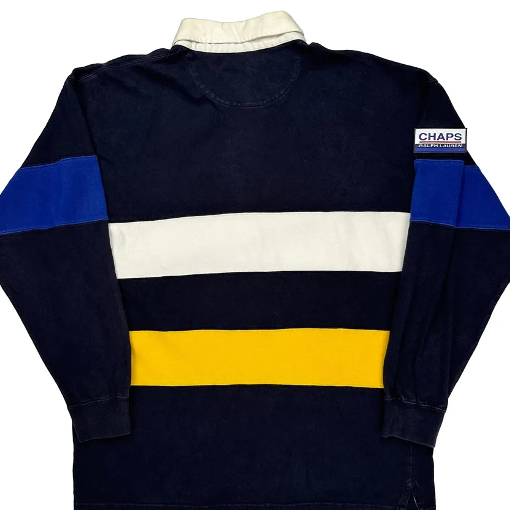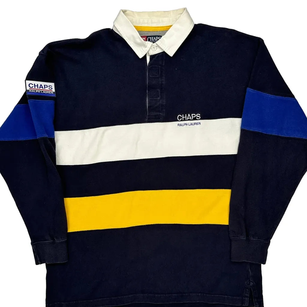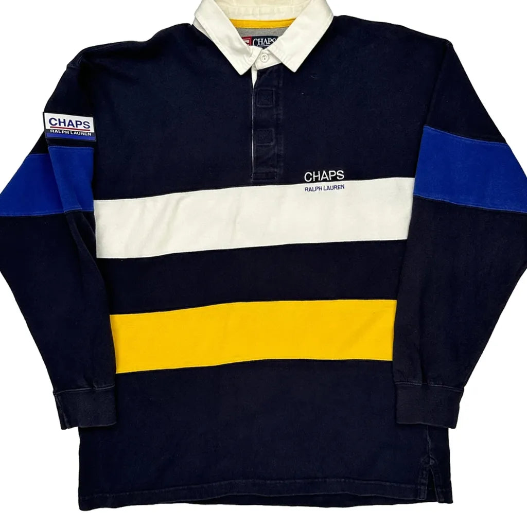 Chaps Ralph Lauren Rugby Shirt With Navy, White, Yellow, And Blue Stripes.