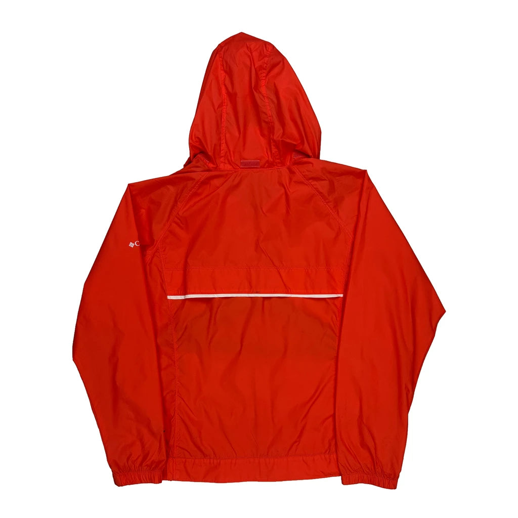 Red Columbia Windbreaker With Hood And Zipper Closure.