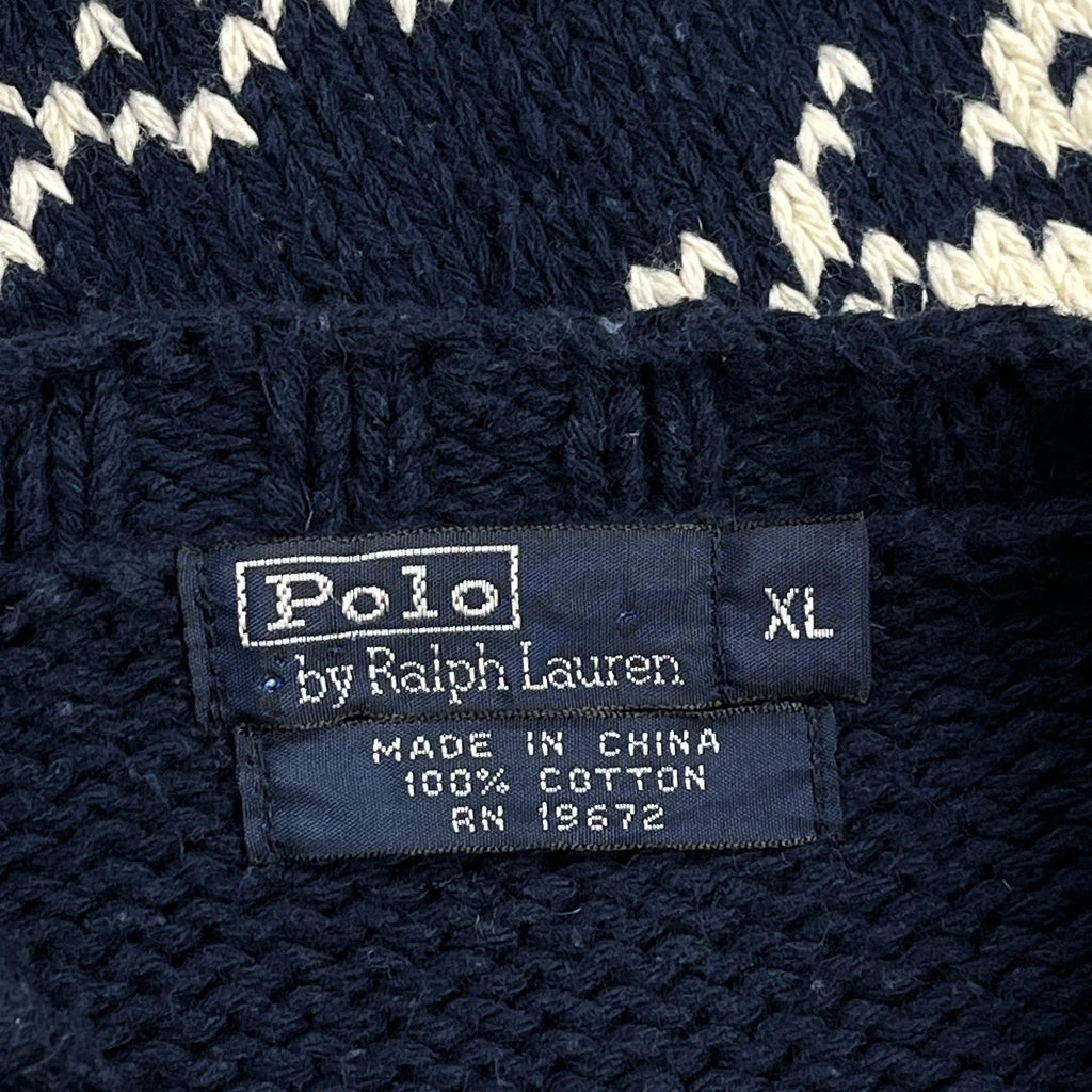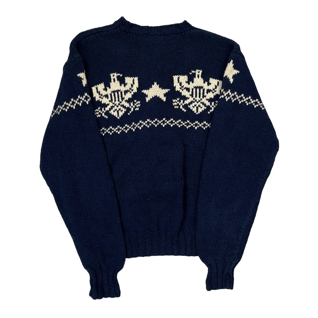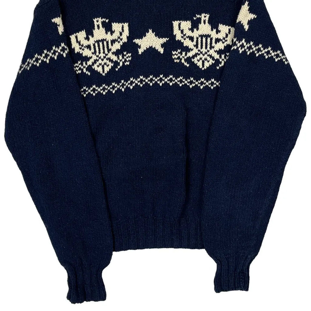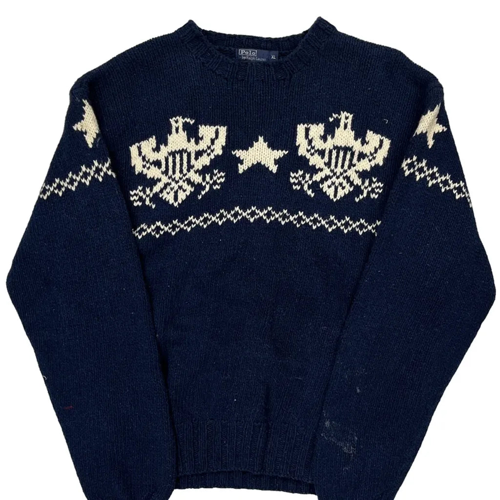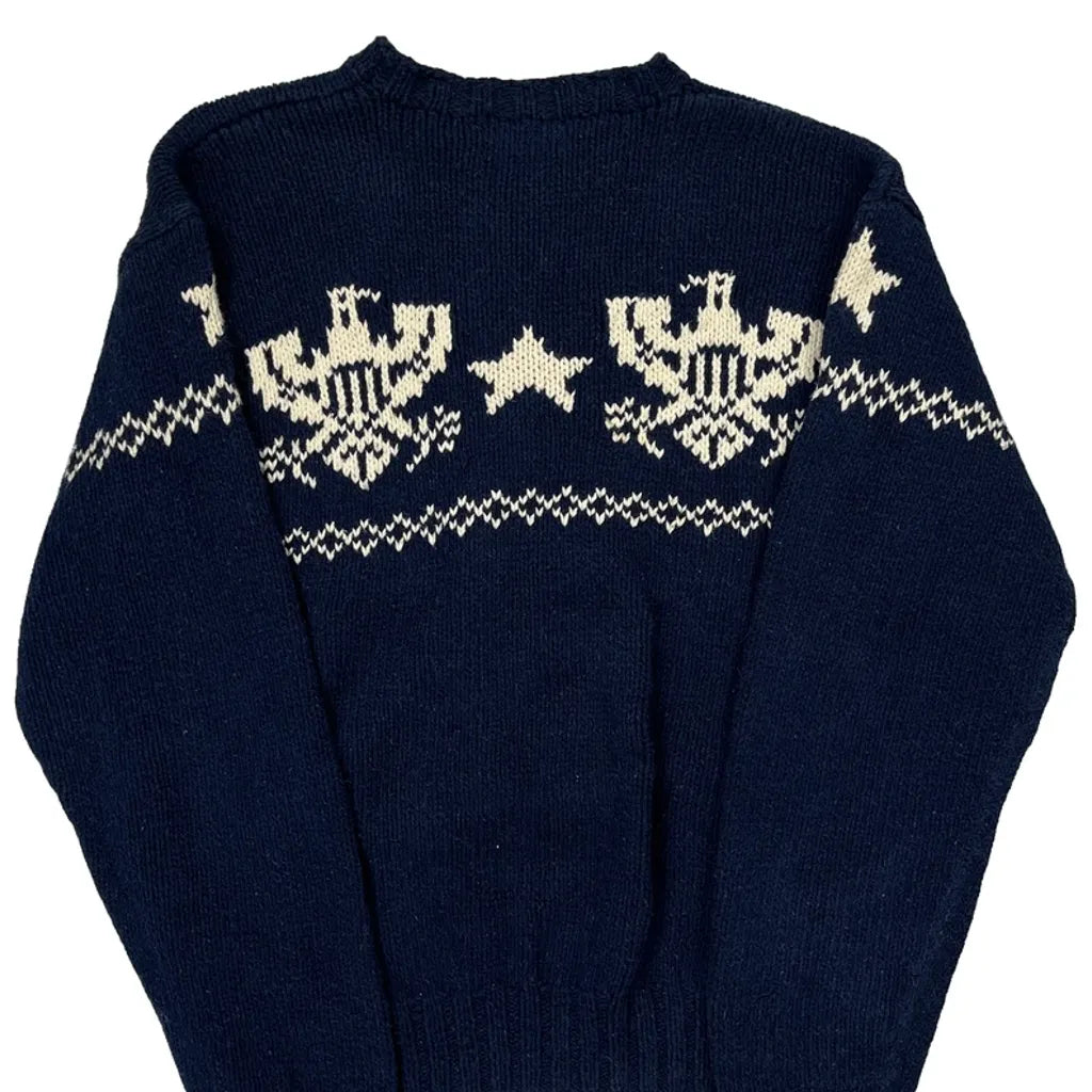 Eagle And Star Pattern Polo By Ralph Lauren Graphic Jumper - XL Navy Cotton
