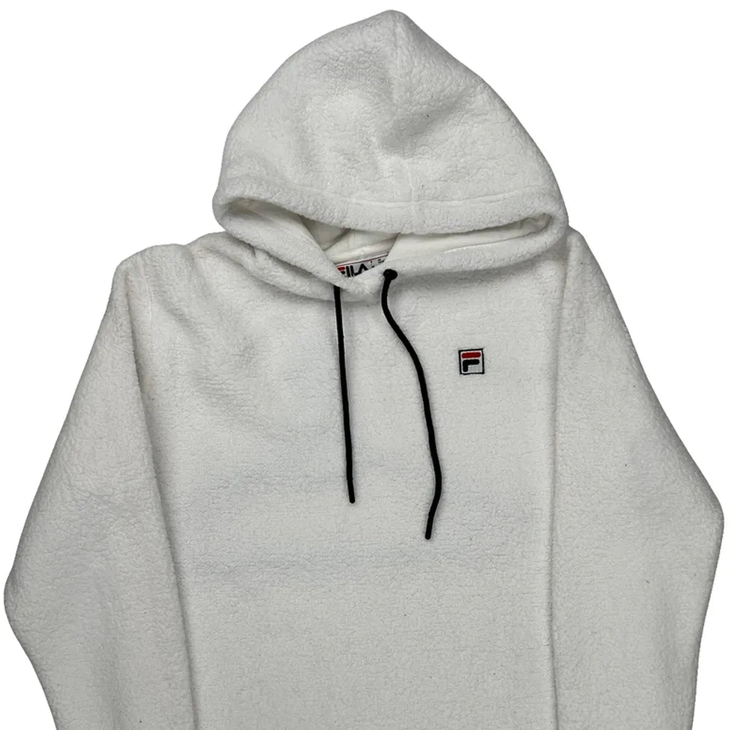 White Hoodie With Black Drawstrings And Small Fila Logo On Chest.