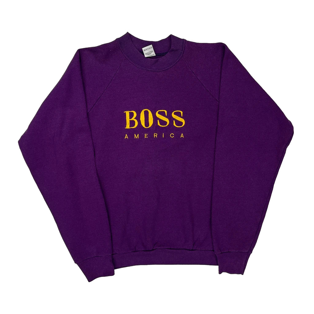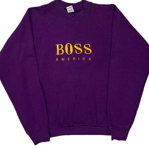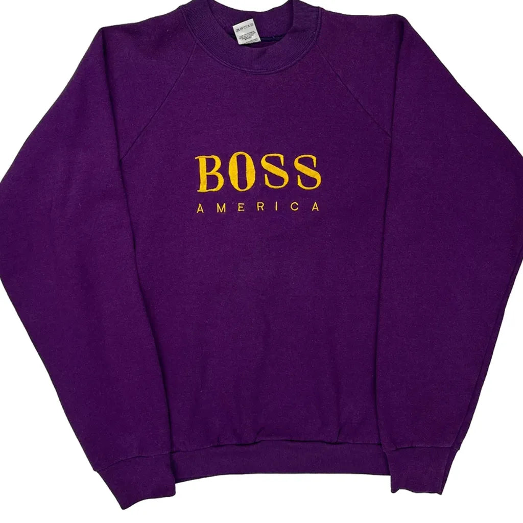 Purple Long Sleeve T-Shirt With Yellow 'Boss America' Text On Front.