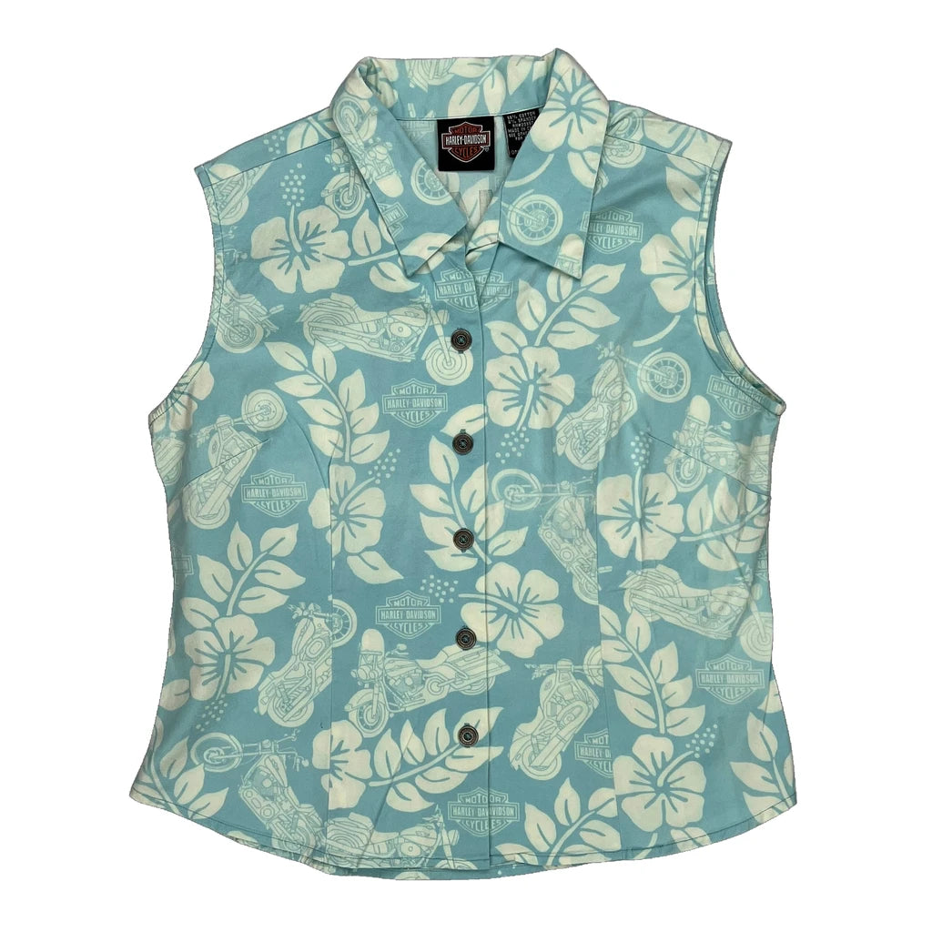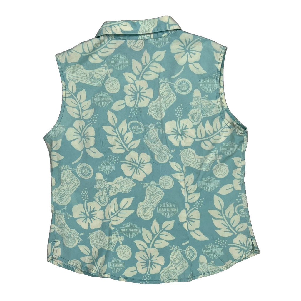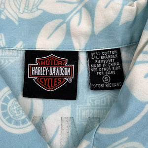 Harley Davidson Floral Hawaiian Shirt - Small Blue Cotton