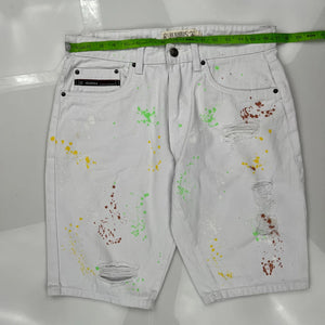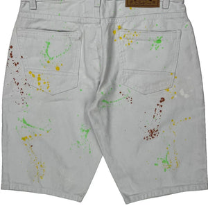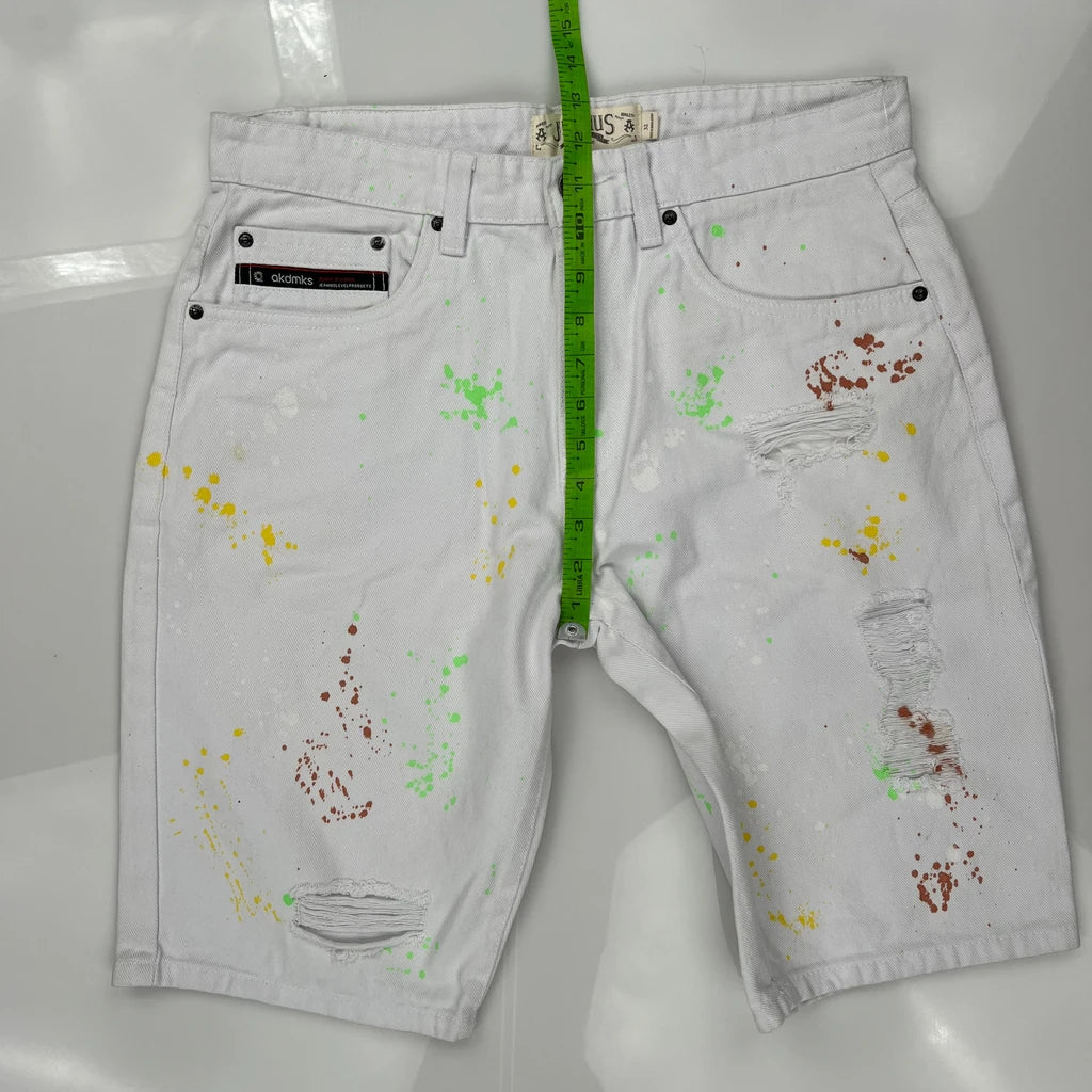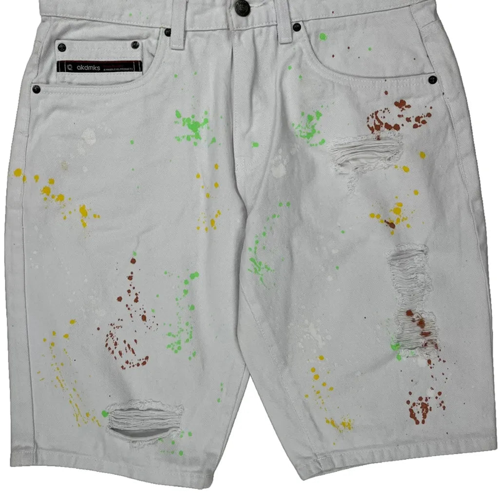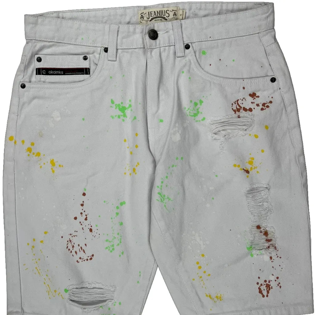 White Denim Shorts With Multicolored Paint Splatters And Ripped Details.
