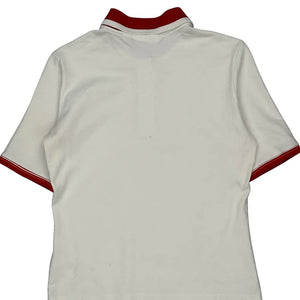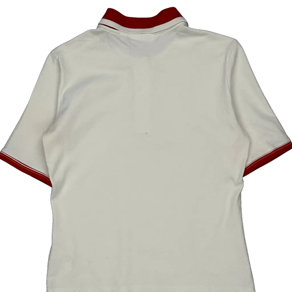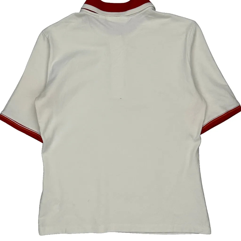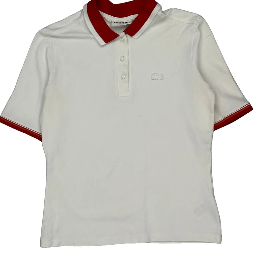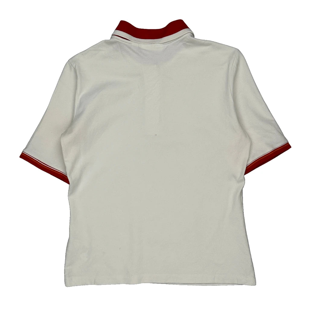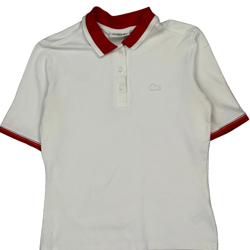 White Polo Shirt With Red Collar And Sleeve Trim.