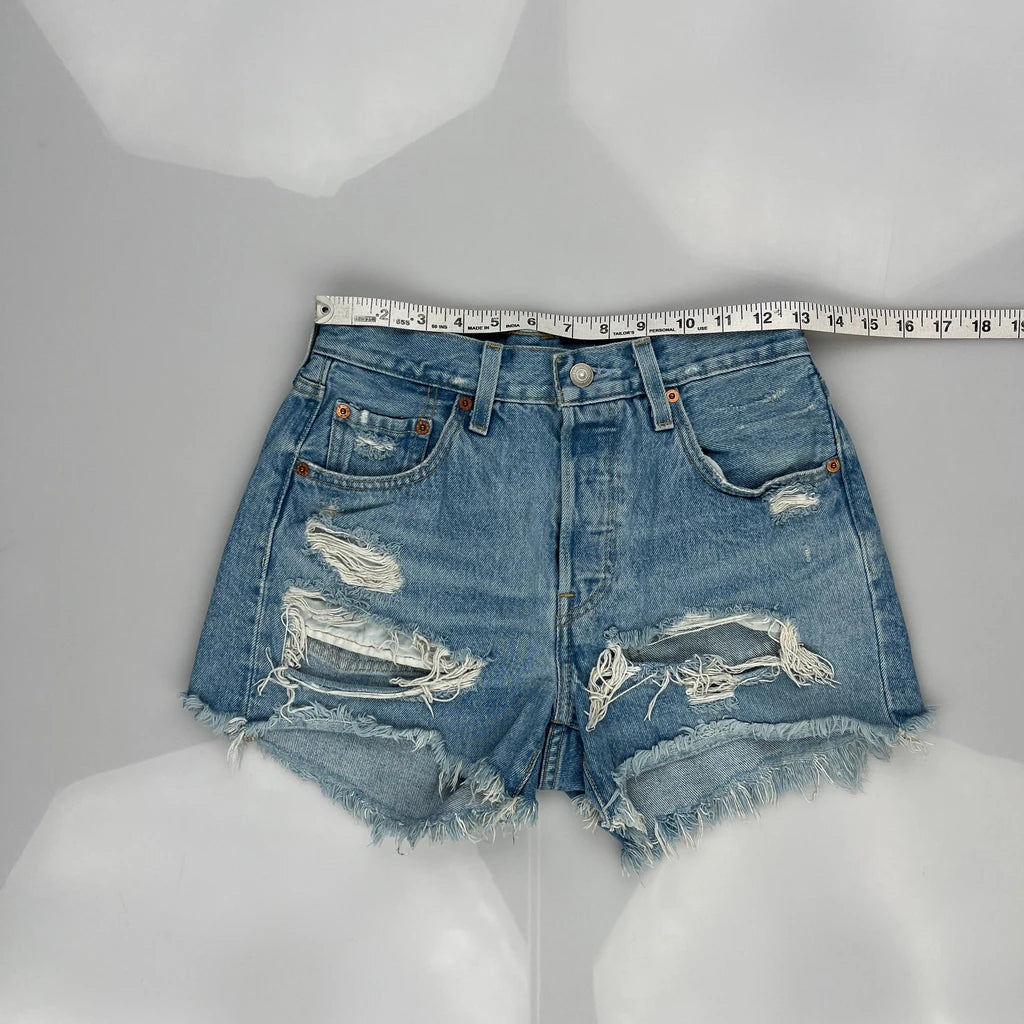Levis Denim Shorts, fit a UK size 6 with a 26″ Waist.
