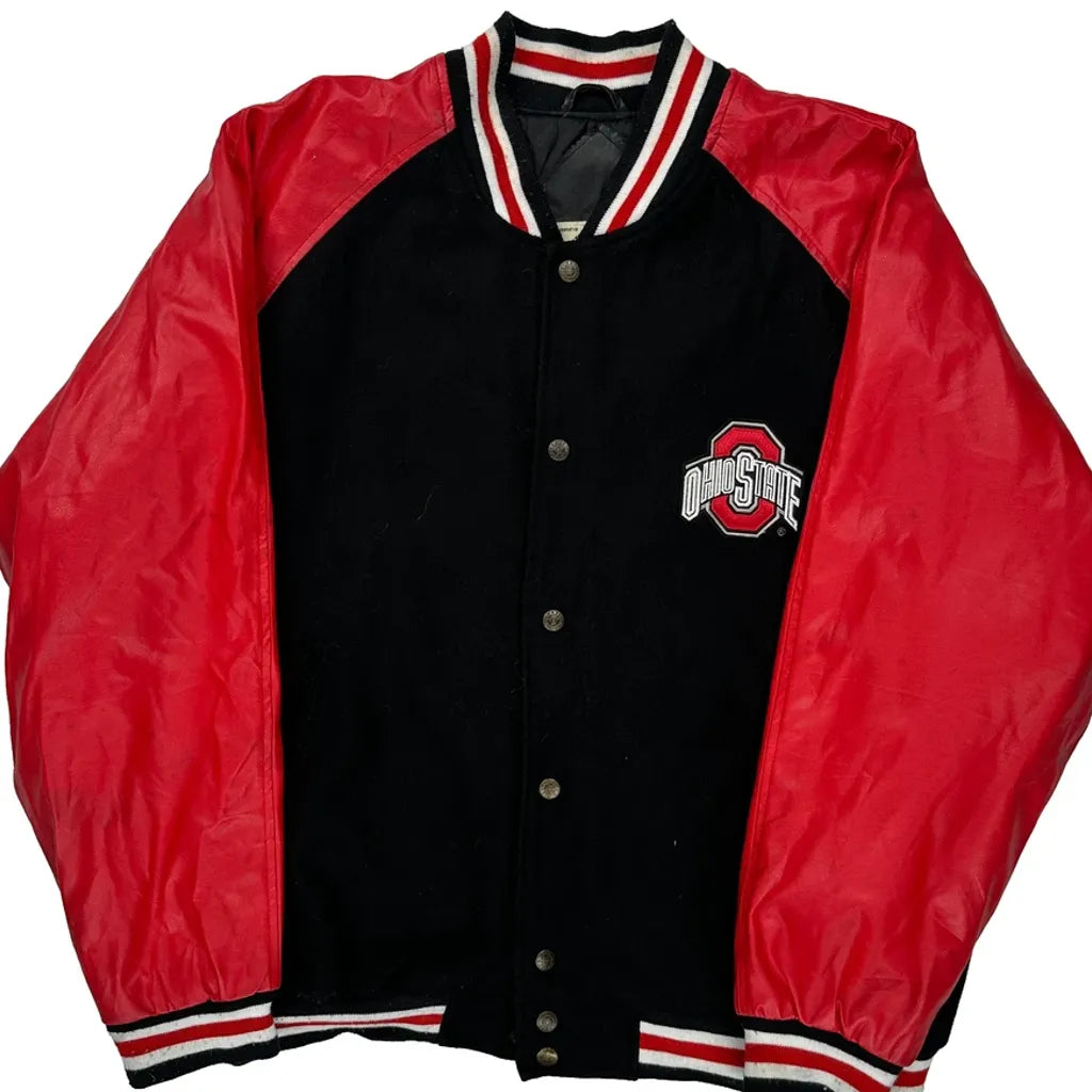 Ohio State Varsity Jacket With Red Sleeves And Black Body.