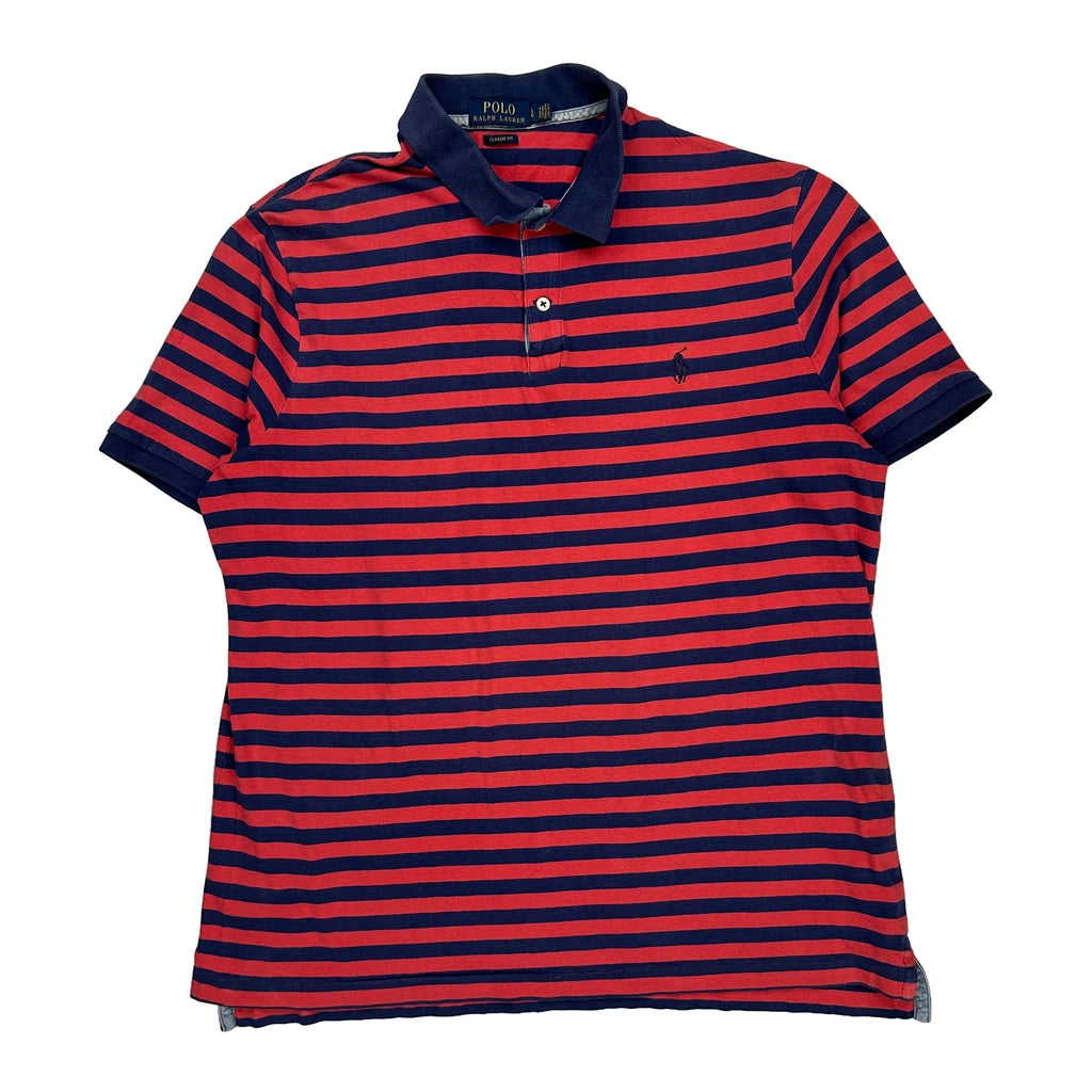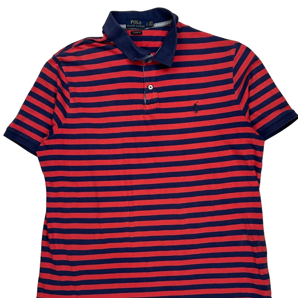 Red And Blue Striped Polo Shirt With Navy Collar