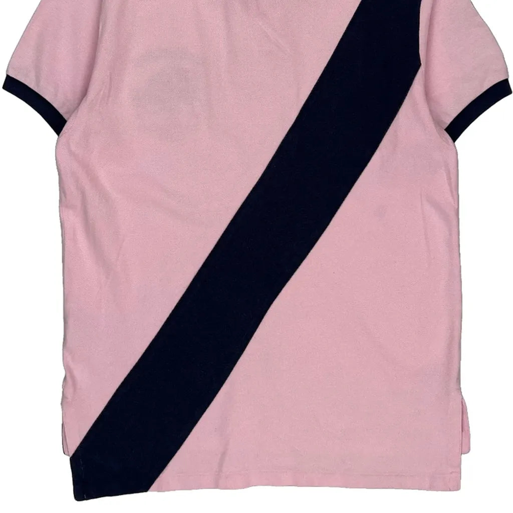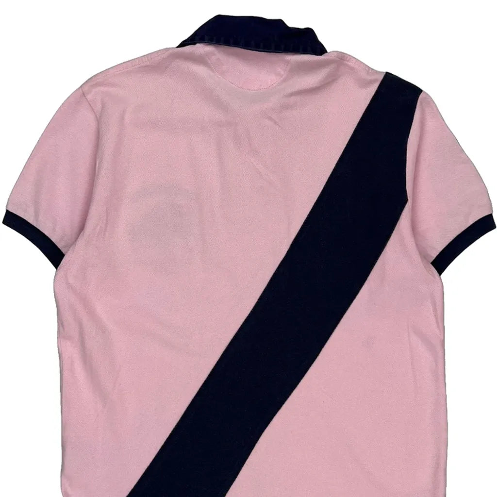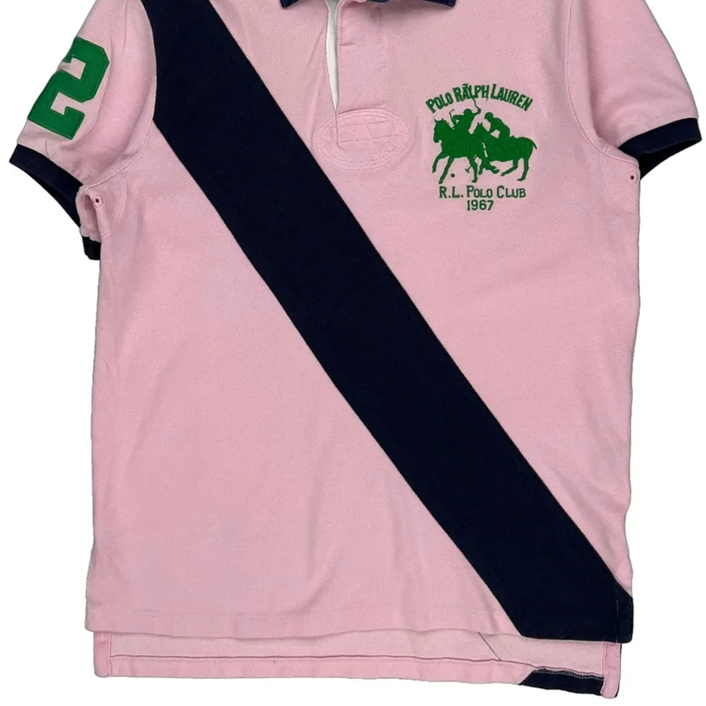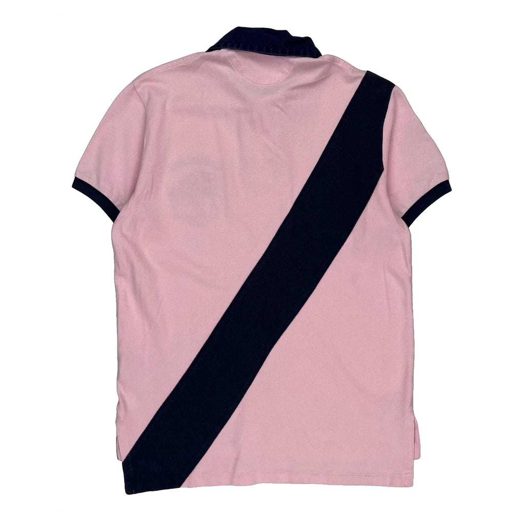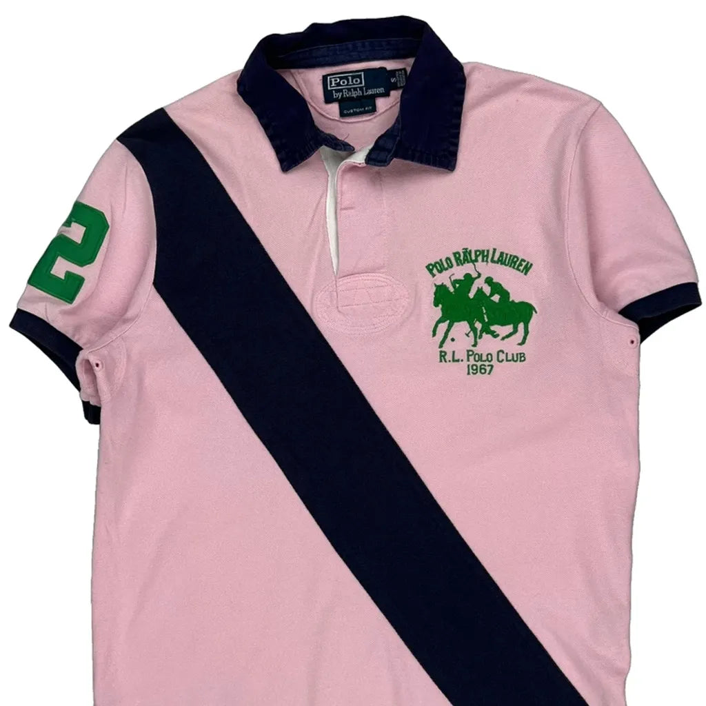 Pink And Navy Polo Shirt With Green Logo And Number 2 On Sleeve