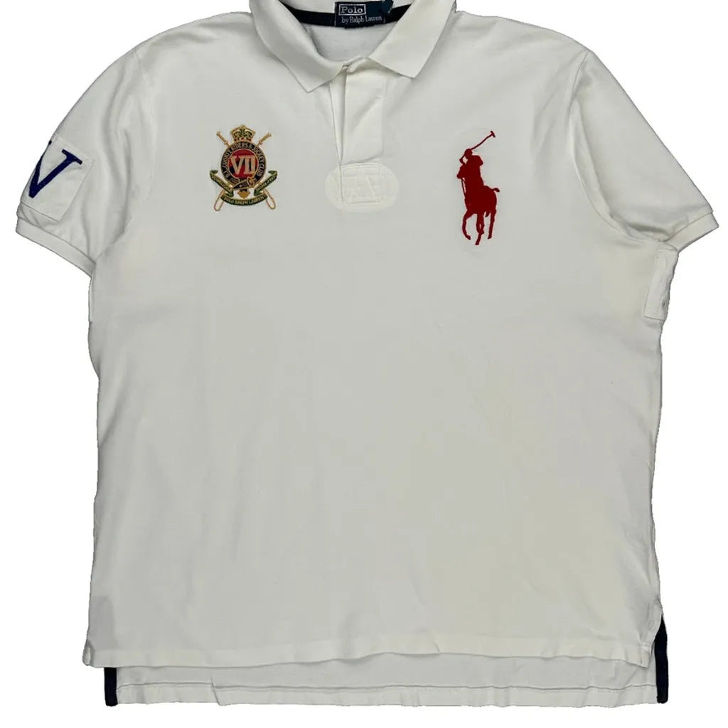 White Polo Shirt With Embroidered Logos And Polo Player Design.