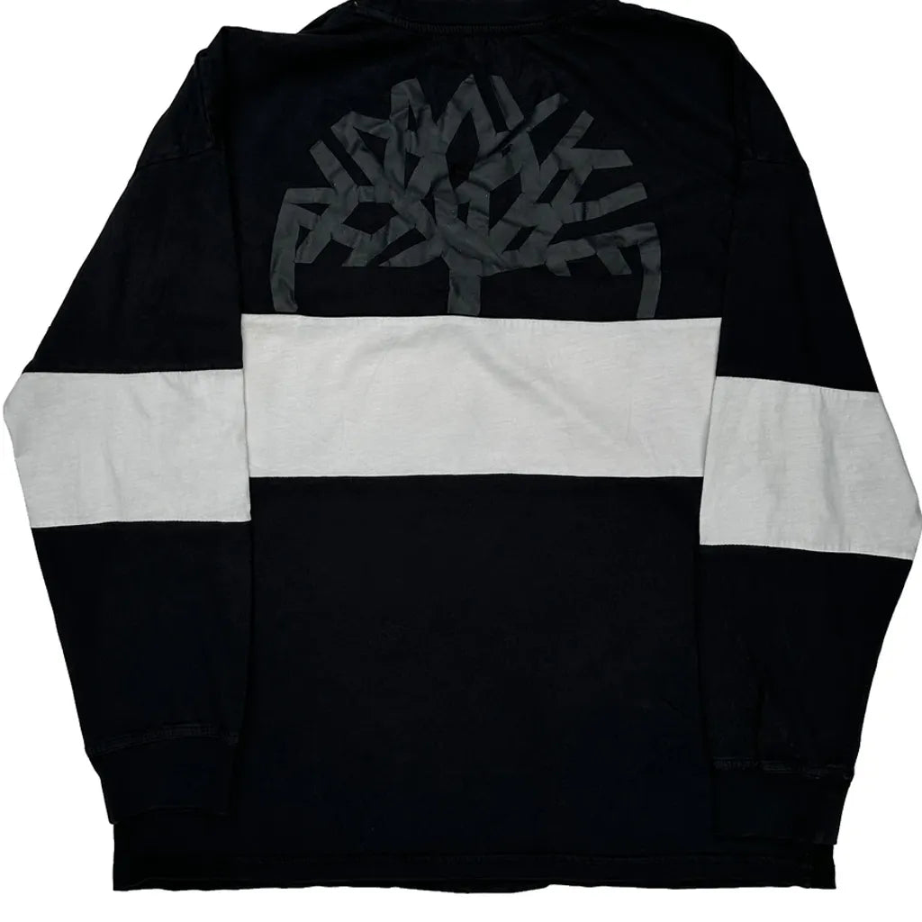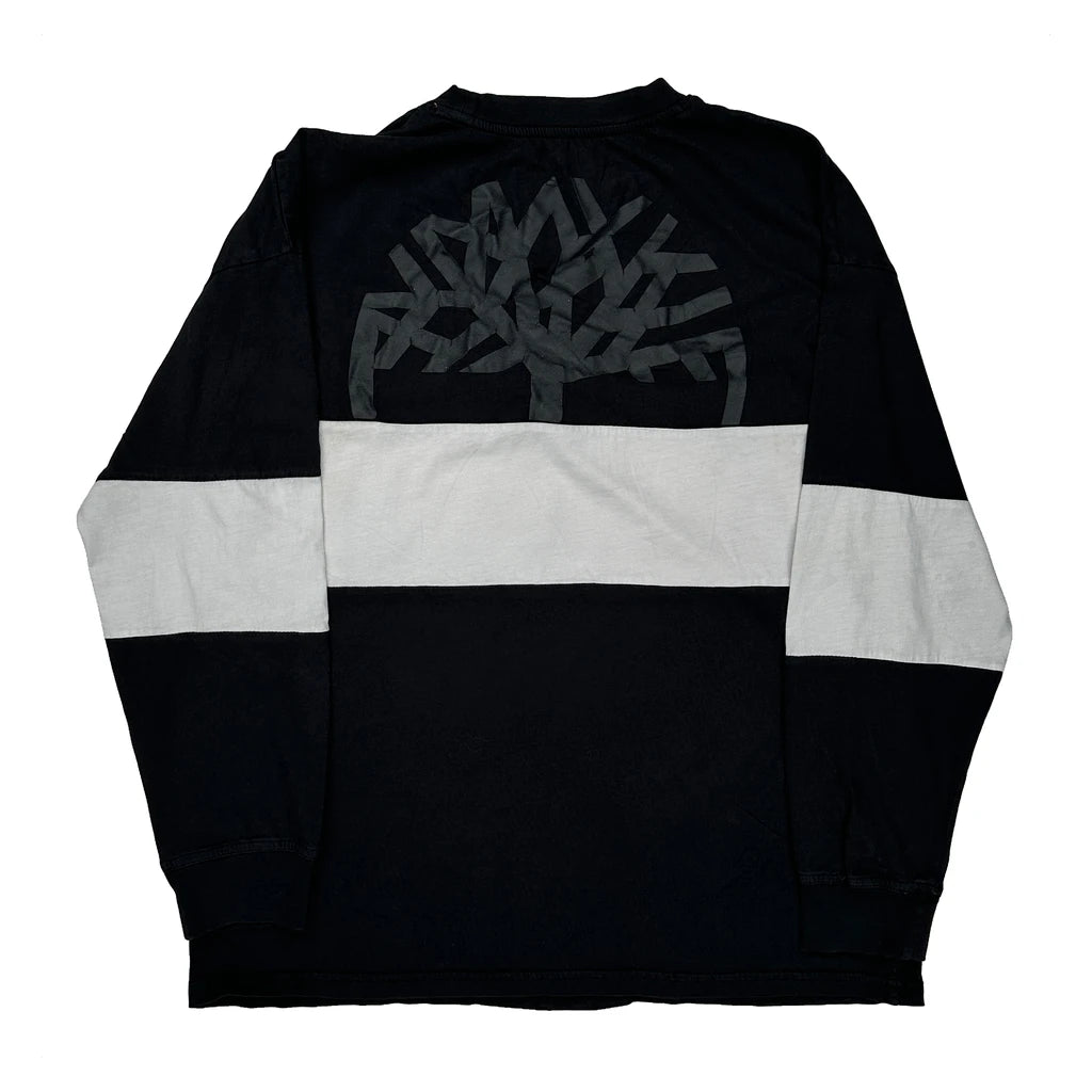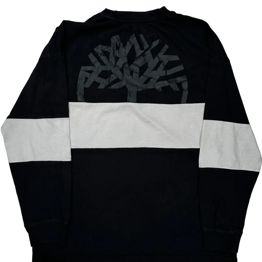 Black And White Timberland Long Sleeve T-Shirt With Logo On Front And Tree Graphic On Back.