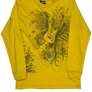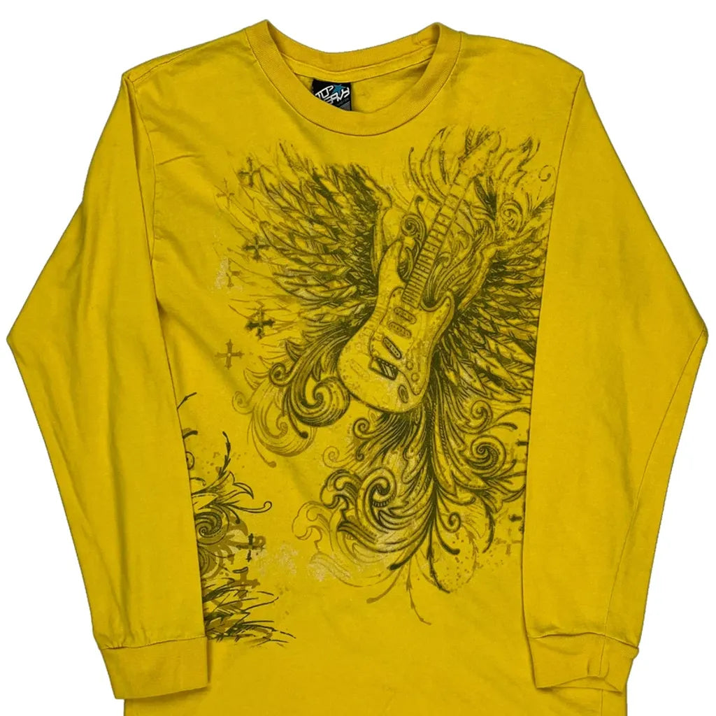 Yellow Long Sleeve T-Shirt With Guitar Graphic Design.