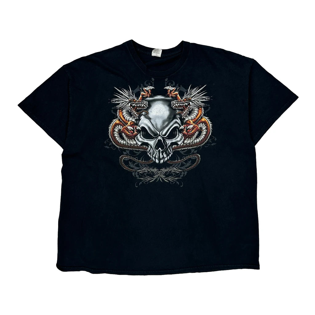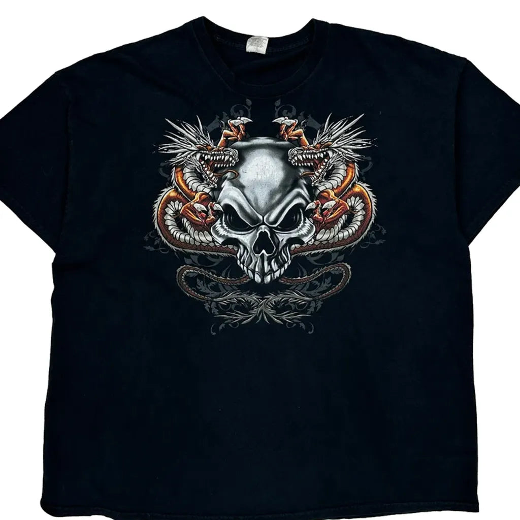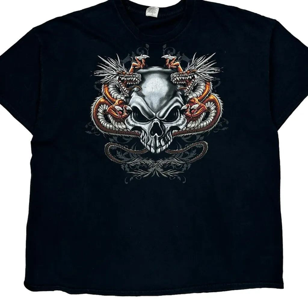 Black T-Shirt With A Skull And Dragon Graphic Design On The Front.