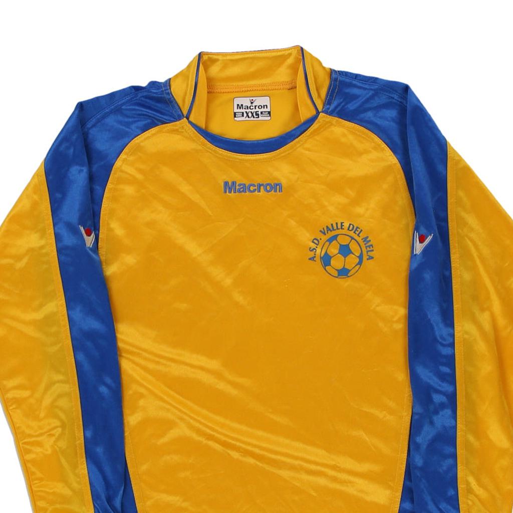 Vintage Age 14 yellow Macron football shirt, fits xx-small.