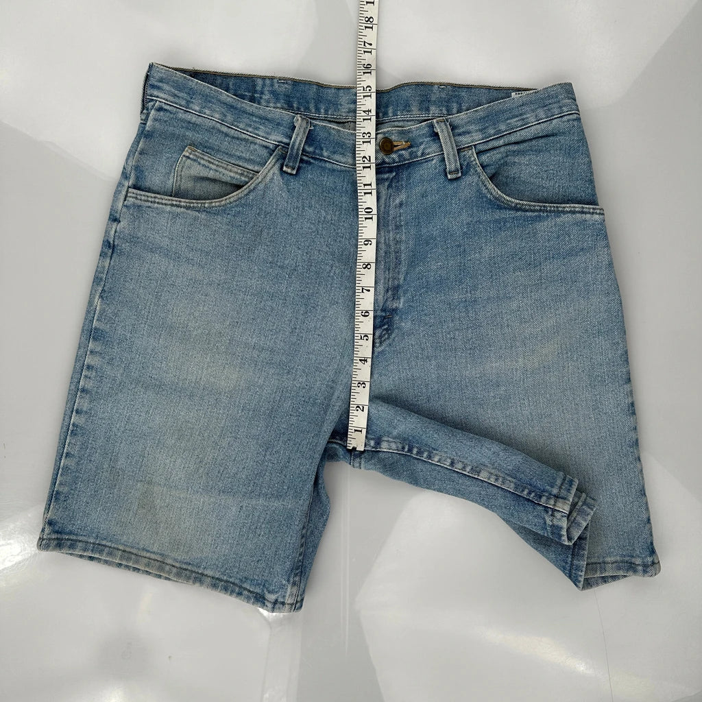 Wrangler Denim Shorts, fit a 36″ Waist and 9″ inseam.